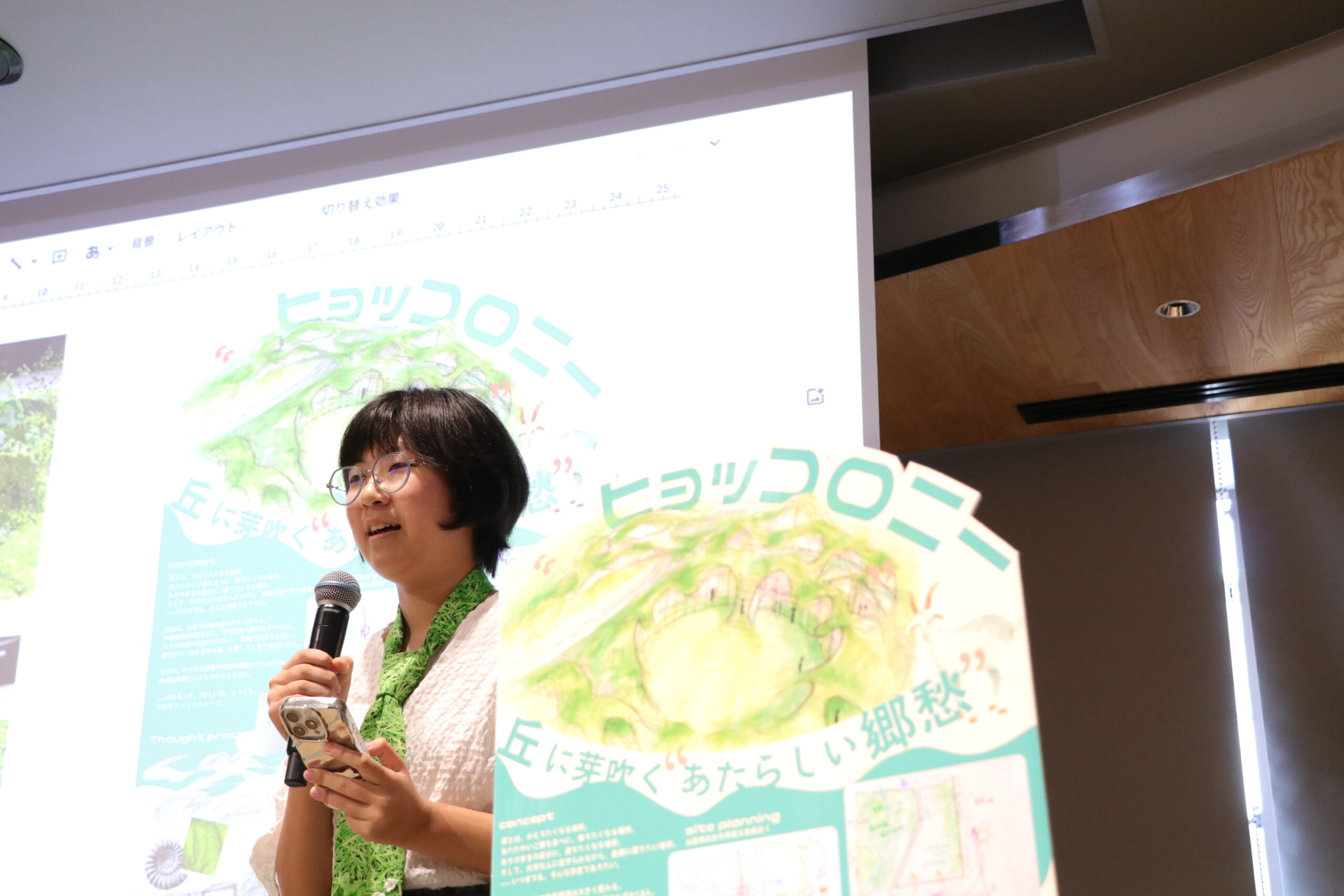 当日は大きなスクリーンを背に、チームごとにマイクを繋いでプレゼンテーションを行いました。 「この屋根の形は、風をこう通すために工夫しました!」 「チームで意見が割れた時は大変だったけど、みんなのアイデアを合体させました!」