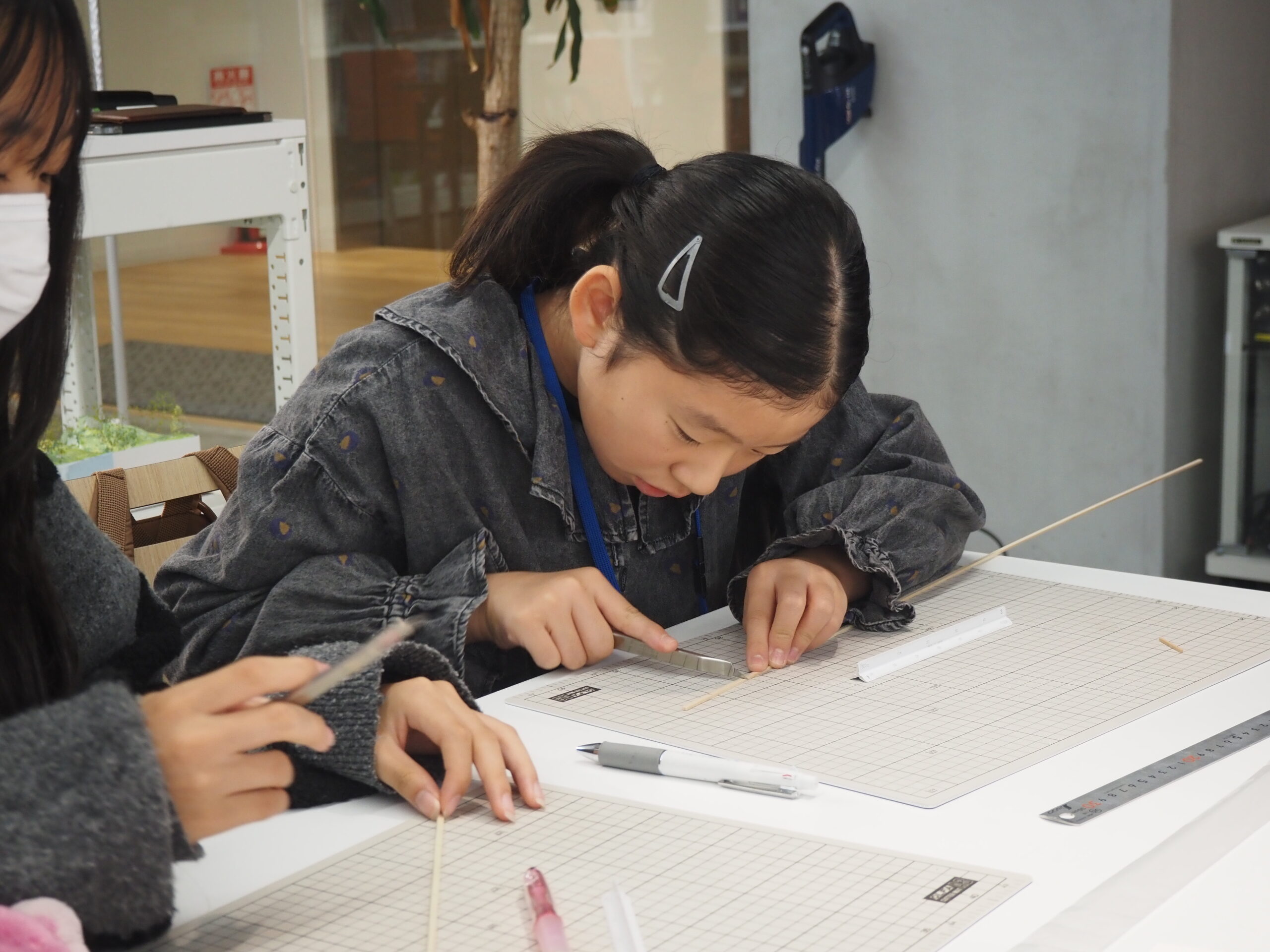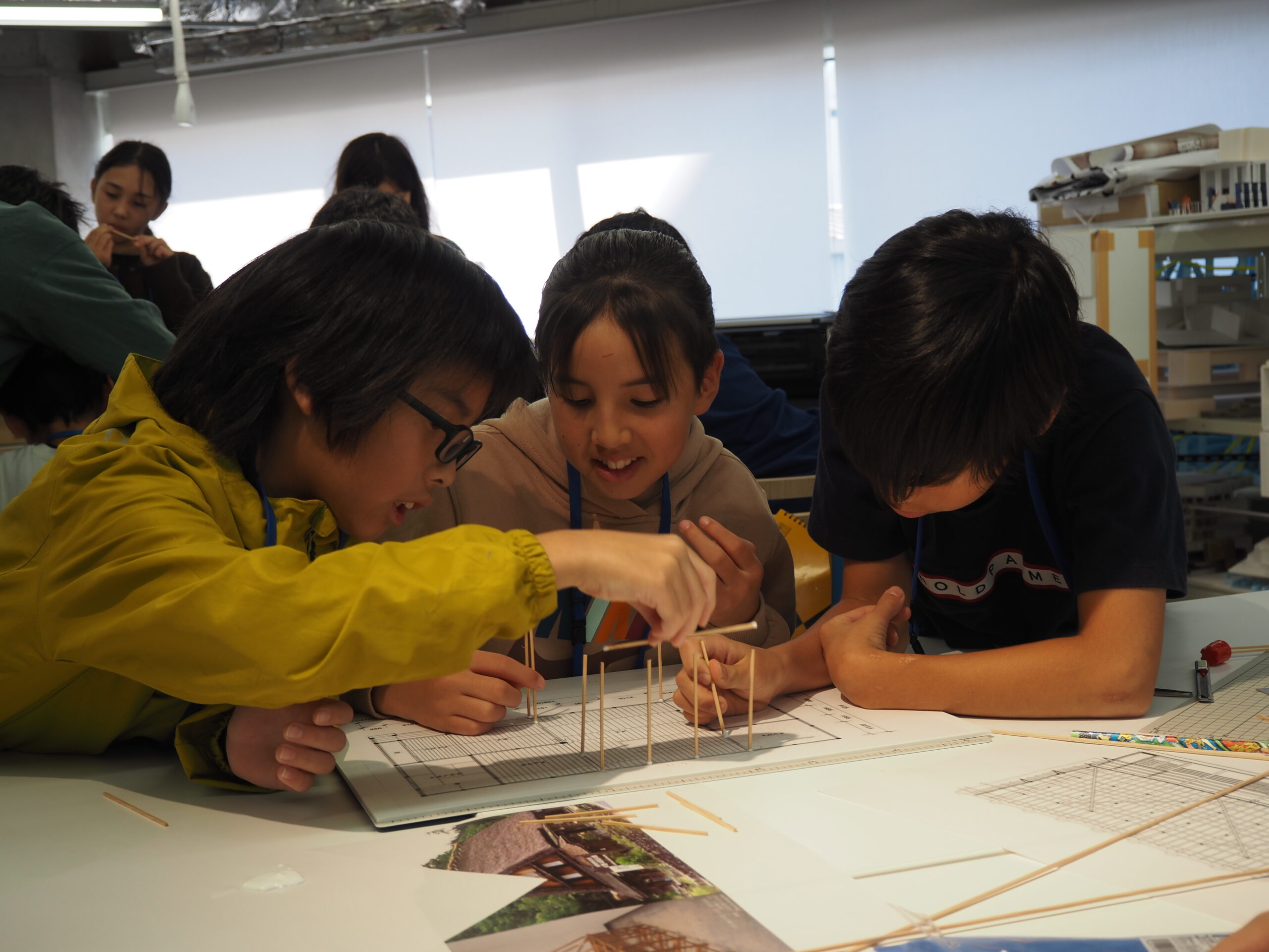 今回の模型づくりは、チームで協力して一つのものを作り上げます 。「柱を切る人」「図面を見て指示する人」「ボンドで組み立てる人」など、自然と役割分担が生まれていました。
