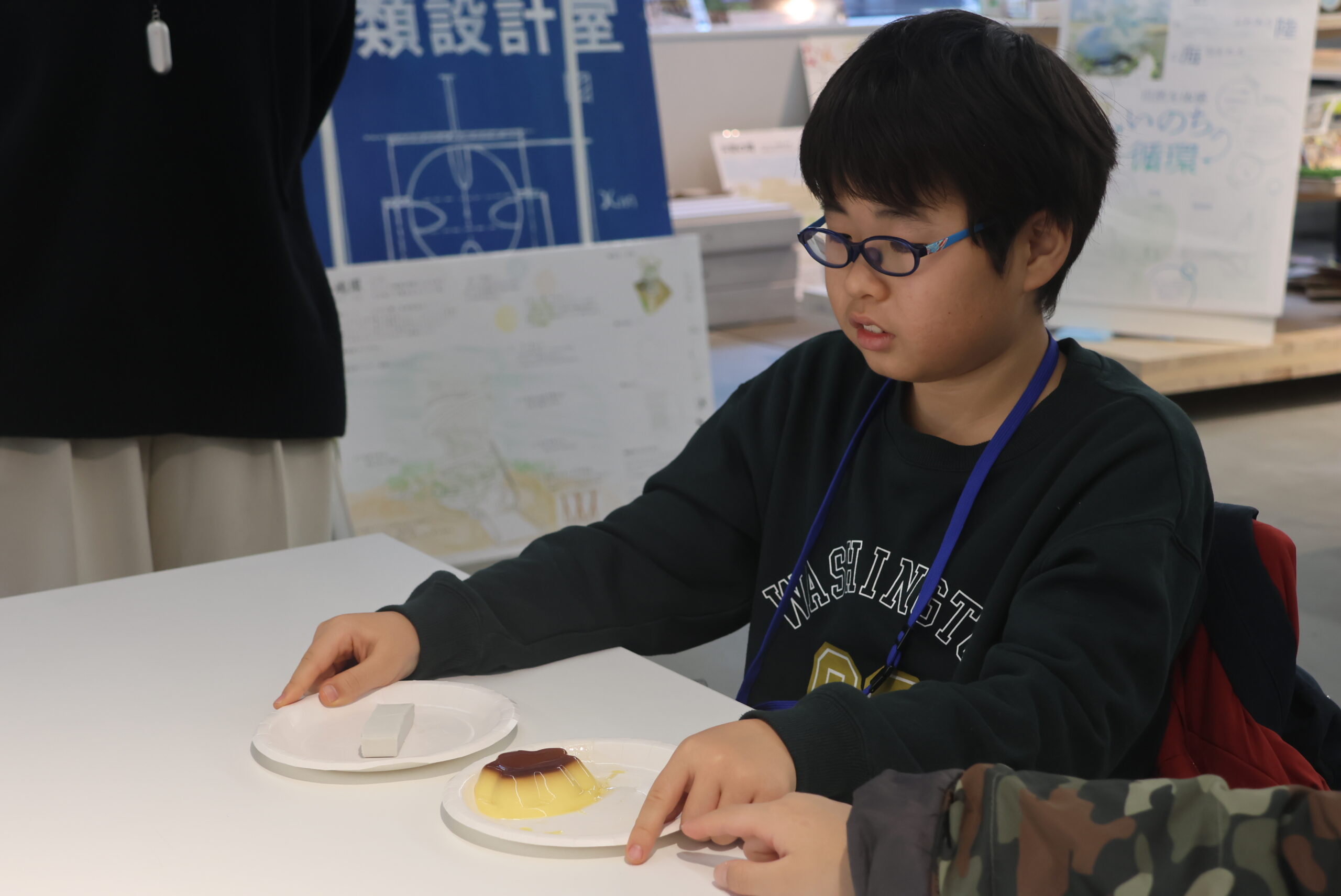 地盤による揺れの違いを学ぶため、子どもたちは「プリン」と「粘土」を使った実験に挑戦しました。