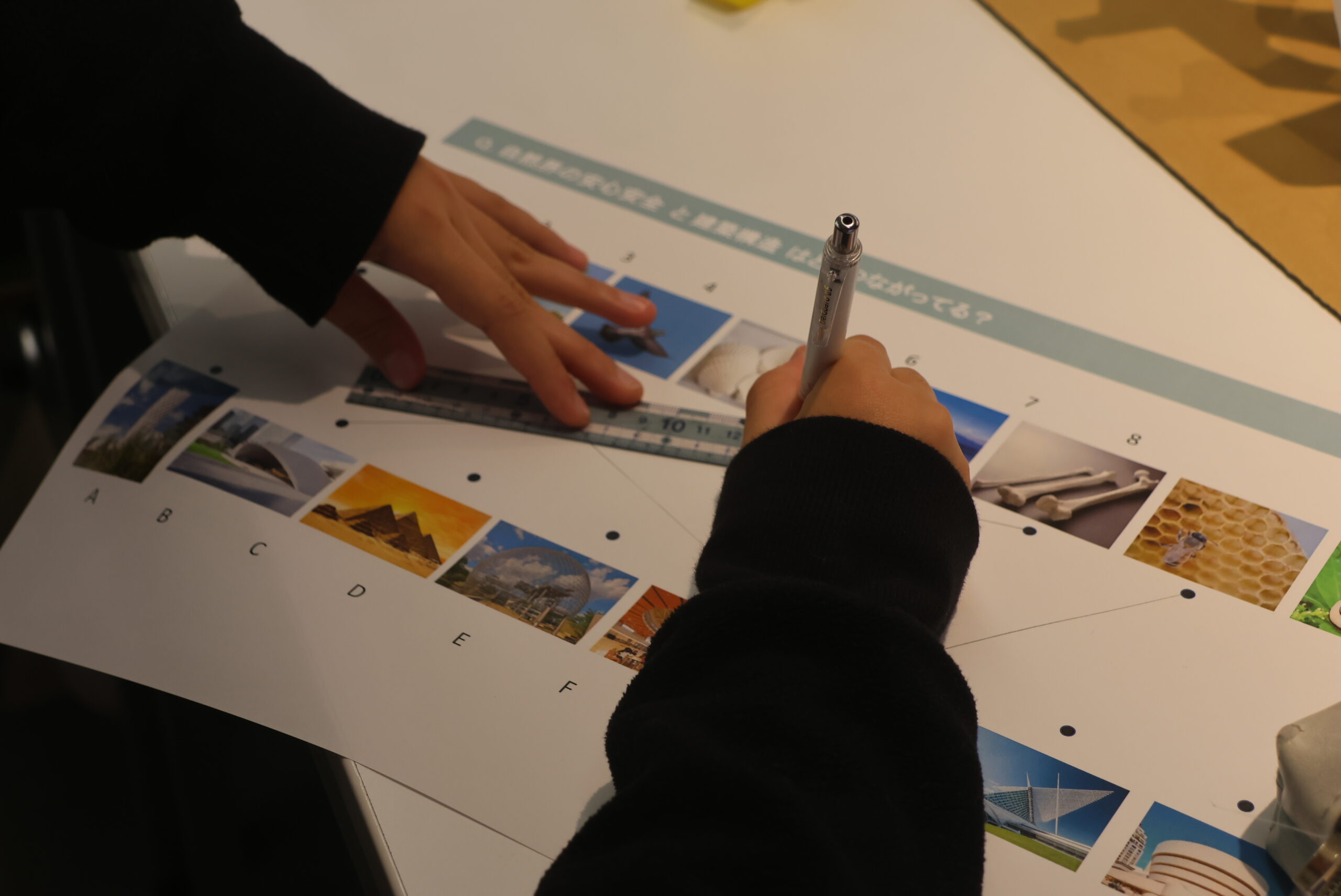 次に、自然界にある「安心安全なカタチ」を建築にどう活かすかを考えました。 木や骨、卵の殻のような自然界の形は、実はとても理にかなった強い構造をしています。子どもたちはグループでワークシートを使いながら、モントリオール・バイオスフィアやグラングリーン大阪といった実例と結びつけ、その繋がりを追求していきました。