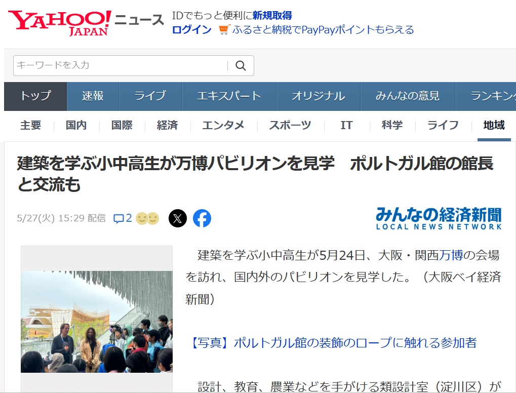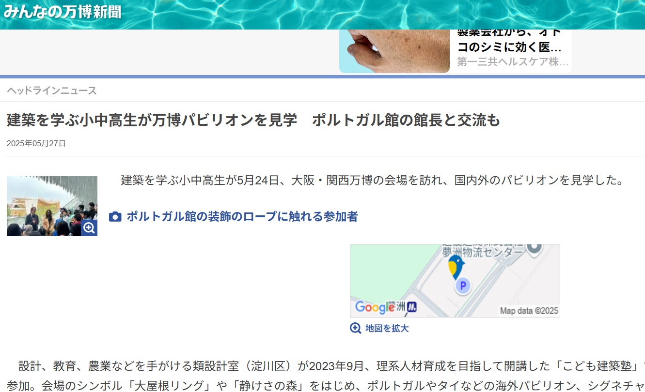5月24日に行われた弊社「こども建築塾」塾生たちの万博見学の様子が、大阪ベイエリアのニュースを伝えるWEBメディア「大阪ベイ経済新聞」に記事として掲載されました。
